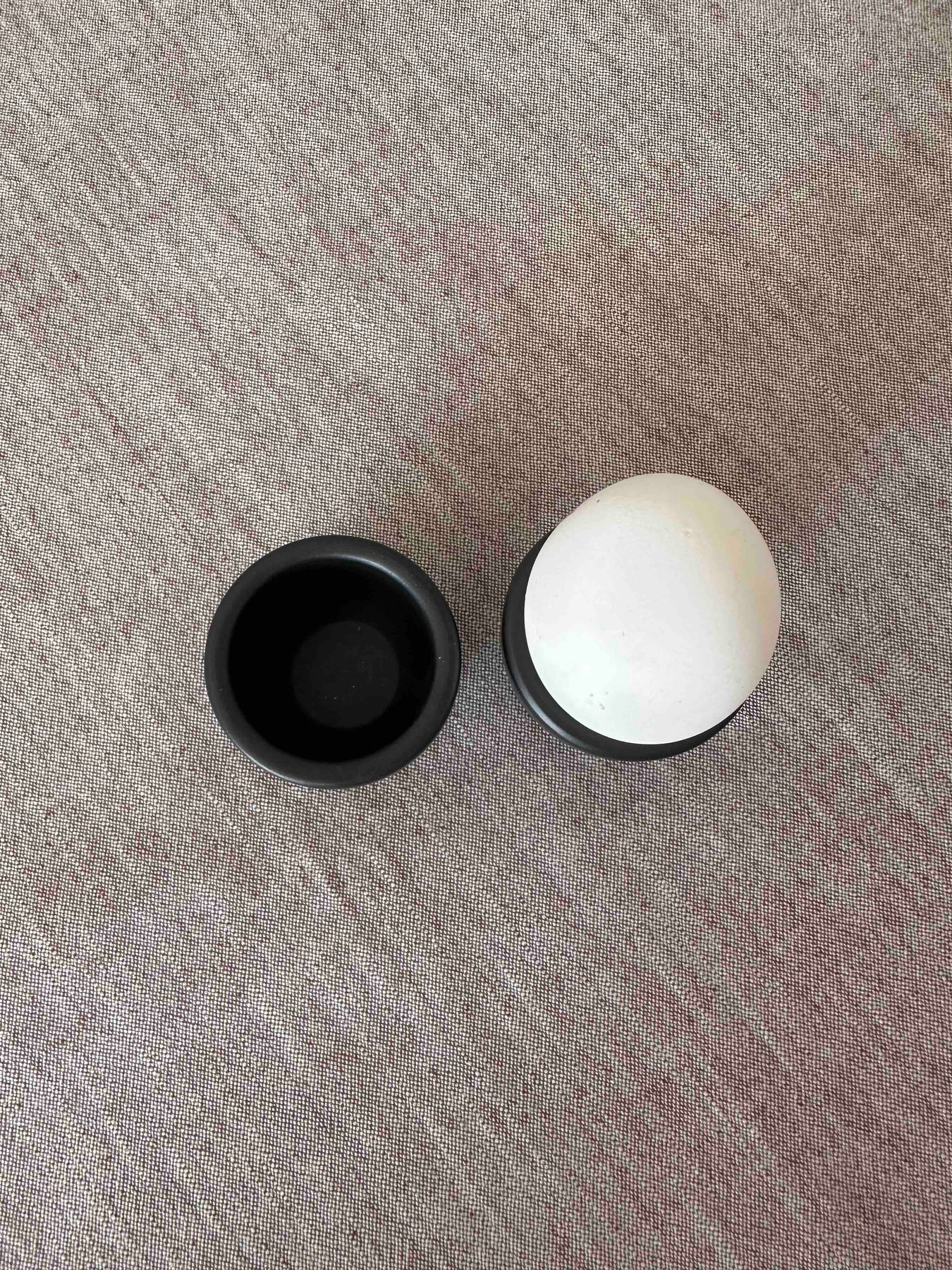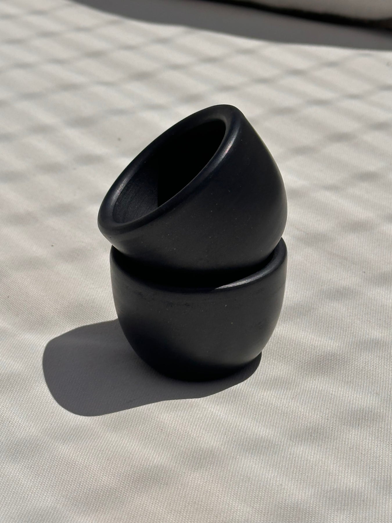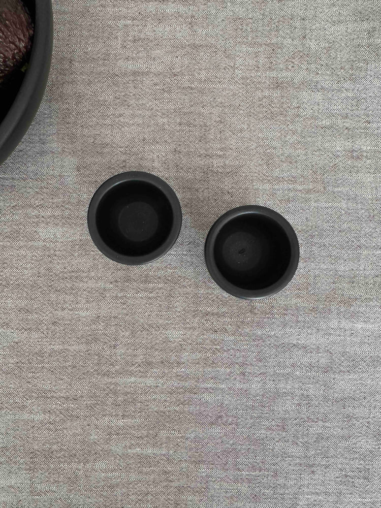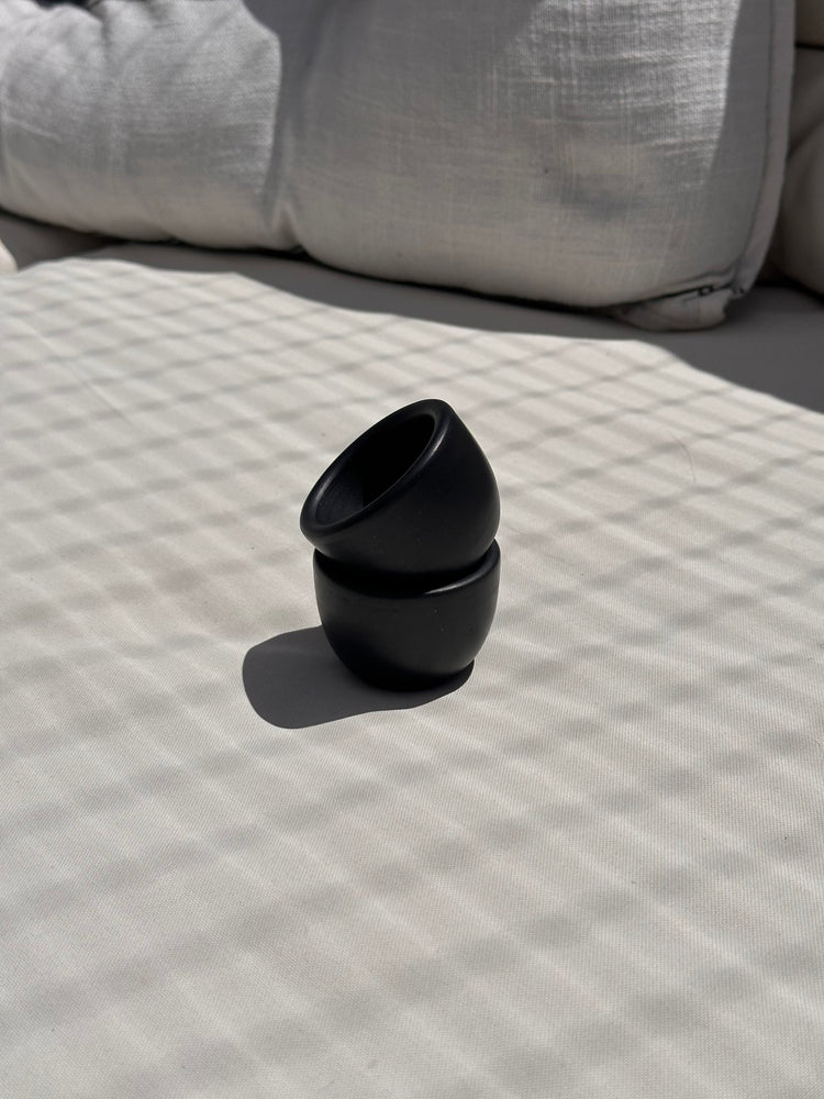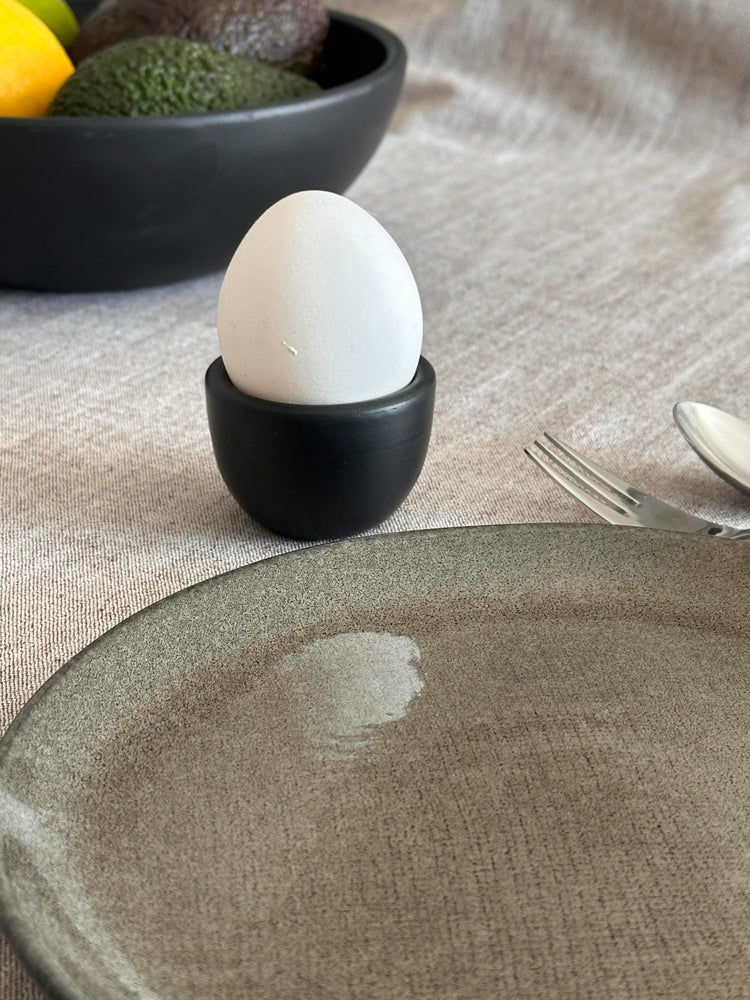 Der tiefschwarze Ton erhält seine Farbe durch das traditionelle, reduktive Brennverfahren – ganz ohne Glasur oder Zusatzstoffe. Die leicht raue, matte Oberfläche verleiht dem Stück eine archaische Schlichtheit, die auf jedem Tisch wirkt. Mit seiner klaren Form und dem angenehmen Gewicht liegt der Eierbecher ruhig in der Hand und bringt natürliche Zurückhaltung ins Frühstücksritual.
