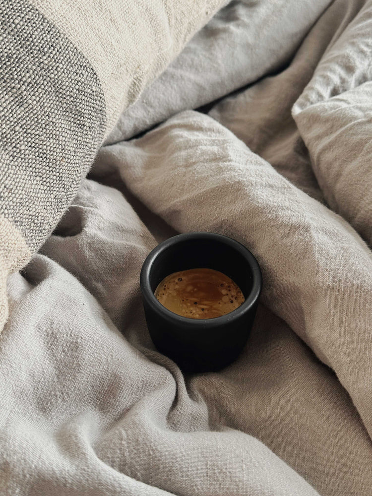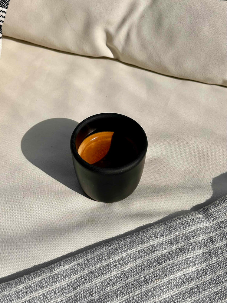 Die Tasse liegt angenehm schwer in der Hand, mit einer leicht rauen Oberfläche und einem matten Finish. Ein stiller Begleiter für den Espresso-Moment – pur, zeitlos und handgemacht in Portugal.